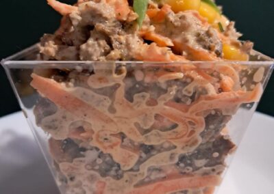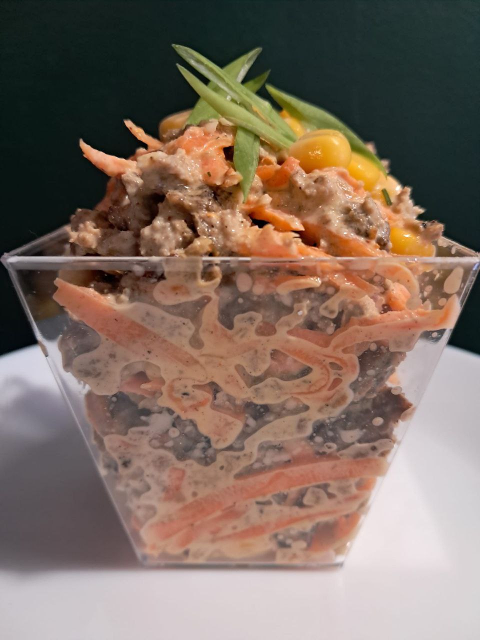 Sałatka z marchewką po koreańsku, naleśnikiem wątrobowym i kukurydzą